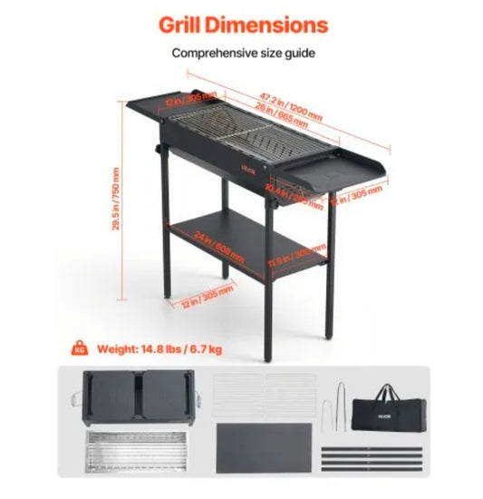 VEVOR Foldable Charcoal Grill, Portable Charcoal Barbecue Grill with Adjustable Height & Folding Side Tables, High-Temp Powder-Coated Steel Outdoor BBQ Grills for Camping Backyard Parties
