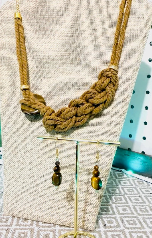 Conjunto exclusivo de collar y pendientes adornados con macramé y disco de ojo de tigre