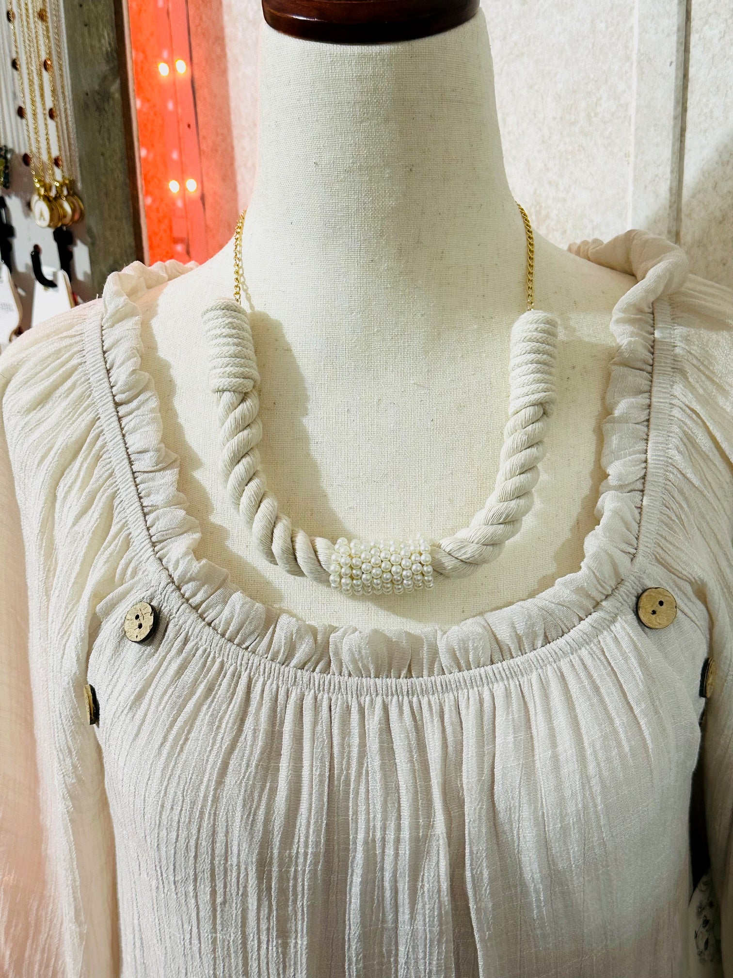Fabricada en cordón de algodón beige, esta llamativa pieza está adornada en el centro con mini perlas falsas para darle un toque de elegancia a una cadena bañada en oro.