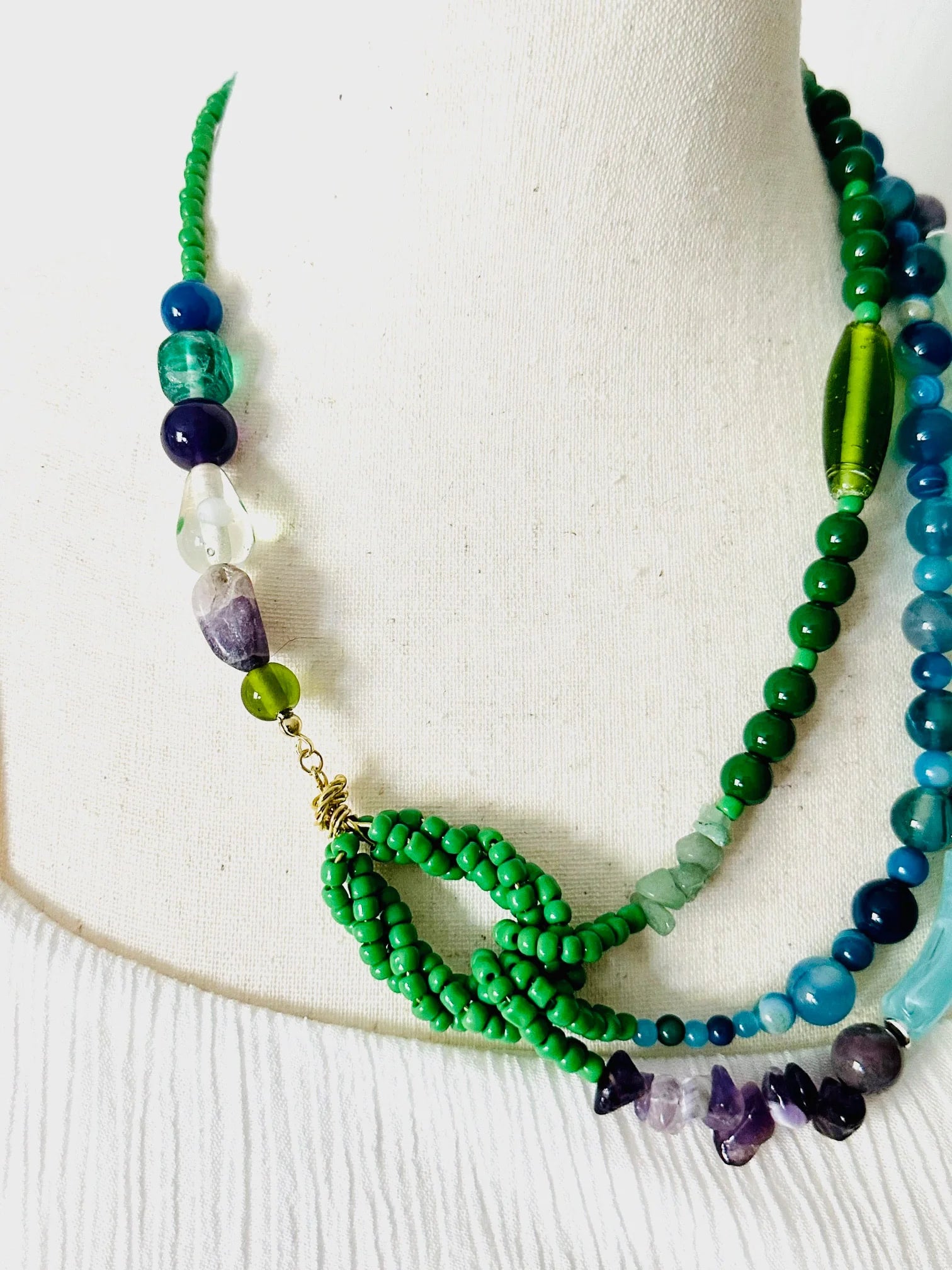The layers of this necklace are meticulously arranged to showcase the lush greenery of seed beads, the rich depth of peacock blue agate, the royal allure of Amethyst, and the organic appeal of green jasper chips. Each bead and chip is carefully chosen for its unique texture, color, and energy, resulting in a visually dynamic and harmonious composition that drapes gracefully around the neck.