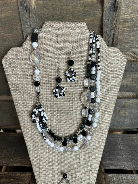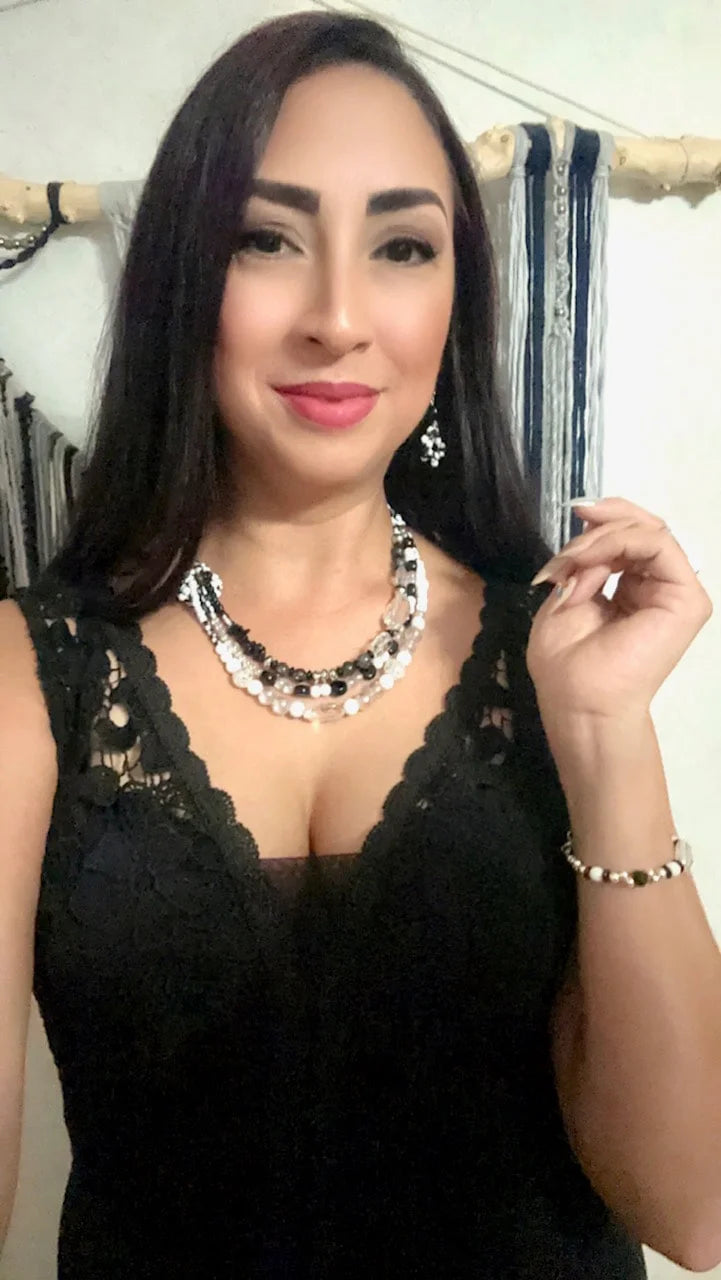 Our multi-layered necklace is a celebration of refined style and meticulous craftsmanship. The play of black, white, and clear beads creates a harmonious blend, ensuring that these accessories effortlessly complement any outfit, from casual chic to formal elegance.