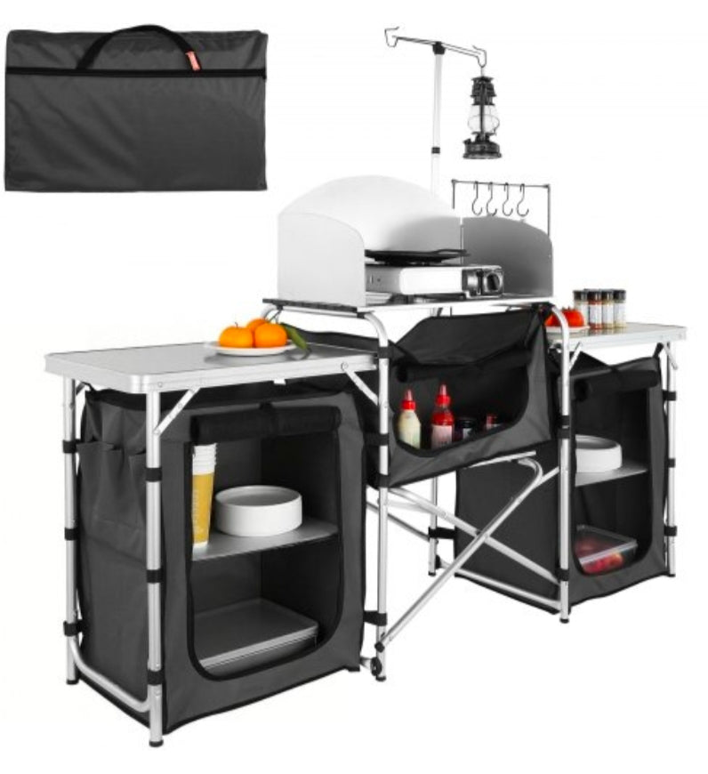 Great Space Management: Our camping kitchen table is designed to take your kitchen outside! You can organize your food, stoves, grills, and cookware in an orderly manner on the tabletop, zippered storage compartments, side table, and storage shelf. You can hang the spatula, ladle, tongs, etc on the hooks