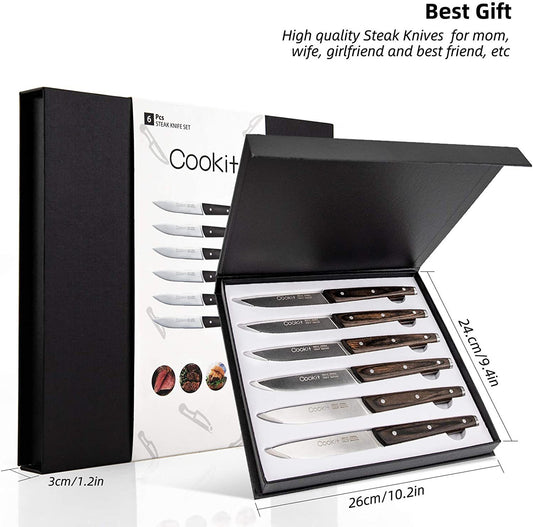 6 件牛排刀套装锯齿状不锈钢多用途刀带木柄适用于家庭餐厅