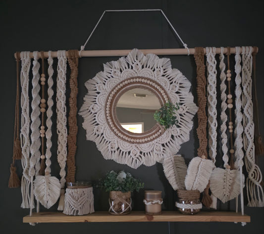 Boho Macramé Wall Hanging with Mirror and Shelf